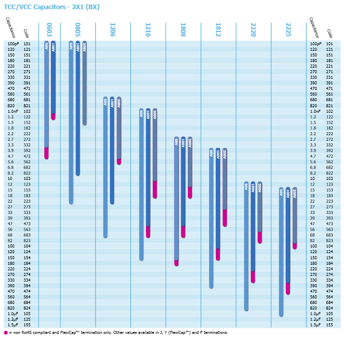 X7R capacitors with a defined capacitance variation under applied dc voltage, across the full operating temperature range. Whilst the capacitance of C0G/NP0 chips does not vary with applied voltage, standard X7R capacitors exhibit capacitance fluctuation but with no specified limit. For applications where a limit is required, Knowles is able to offer either a “B” code dielectric (conforms to MIL “BX” dielectric and IECQ-CECC “2X1”) or “R” code dielectric (conforms to MIL “BZ” dielectric and IECQ-CECC “2C1”).
